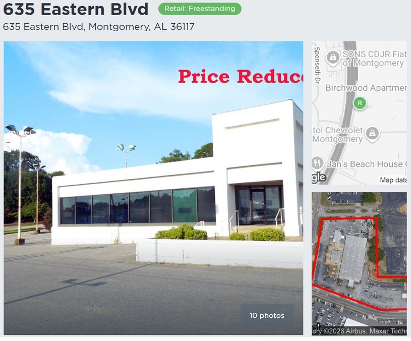 Priced to lease in "as is" condition. Excellent access and visibility from East Boulevard. Commercial and retail use. One-half mile north of I-85/East Boulevard at Exit 6. SHOWN BY APPOINTMENT ONLY. Contact John Stanley, CCIM, for more information at (334) 271-2475.