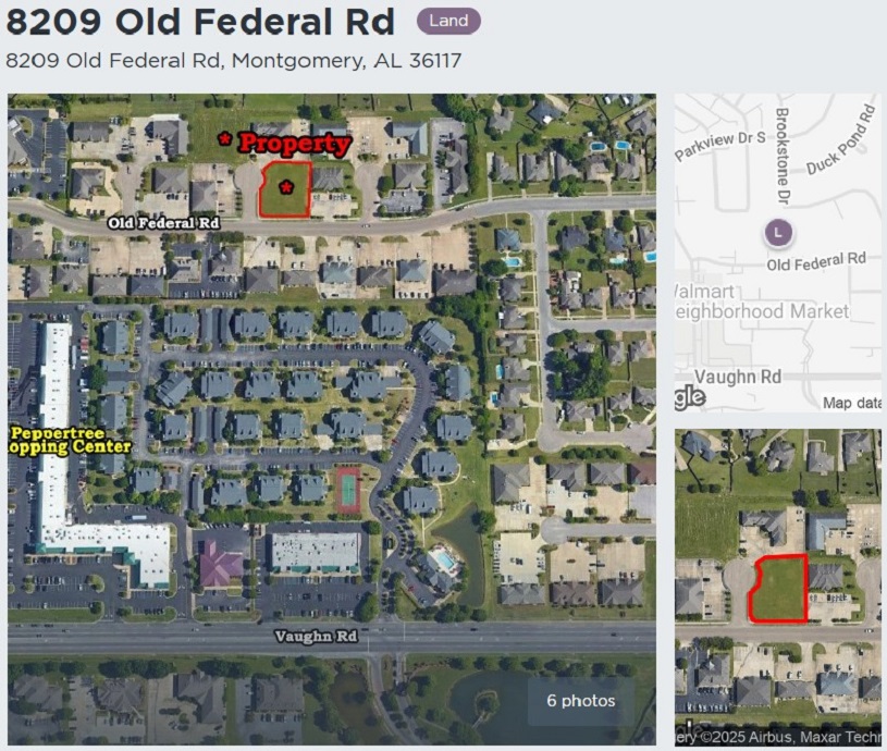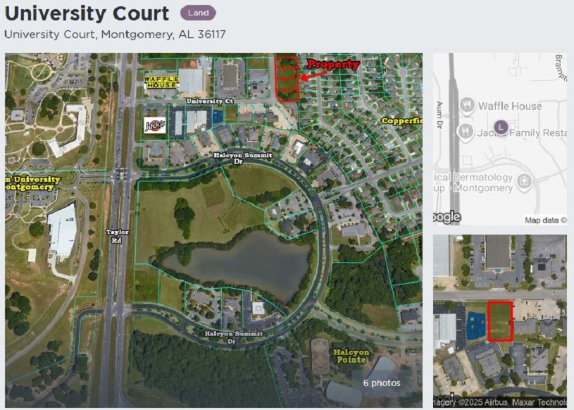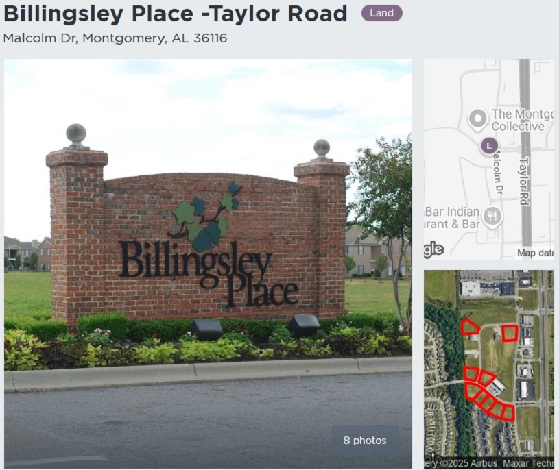 Four (4) individual platted business lots located one (1) block off Taylor Road. Great access to I-85 at Exit 9. Perfect location for office use, day care, and many other commercial/retail uses. Owner will sell all lots together or individually. Contact John Stanley, CCIM, for more information at (334) 271-2475.